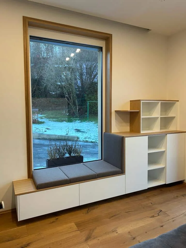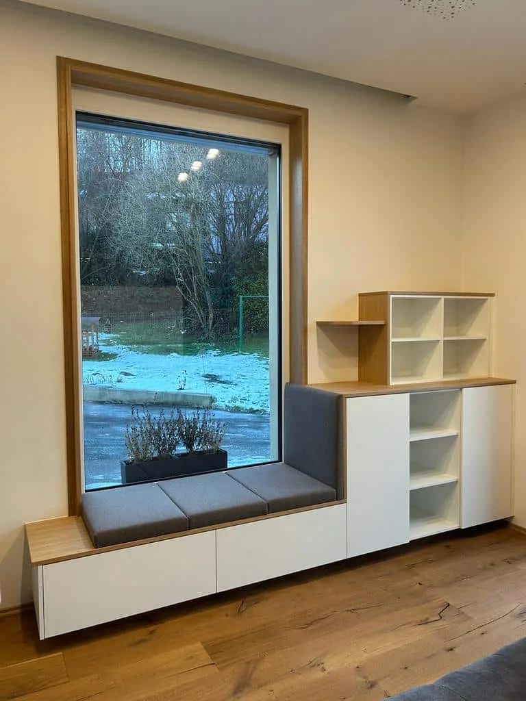 - Zusätzlicher Stauraum: Mit unseren Fensterbänken erhalten Sie nicht nur eine komfortable Sitzgelegenheit, sondern auf Wunsch auch wertvollen Stauraum. Ob Bücher, Dekorationen oder alltägliche Utensilien: Unsere Fensterbänke bieten Platz für alles, was Sie griffbereit halten möchten. Der Stauraum kann (wie im Bild) offen, aber selbstverständlich auch geschlossen gestaltet werden.